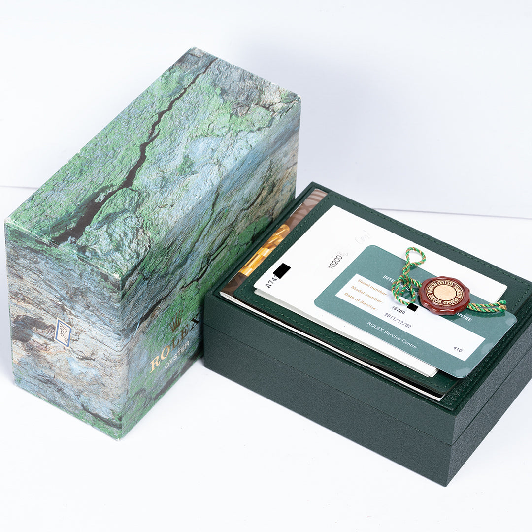 This particular ref. 16200 is in excellent pre-owned condition, meaning there are very light to no signs of wear. The watch includes the original box, papers, and 2011 Rolex Service Card.