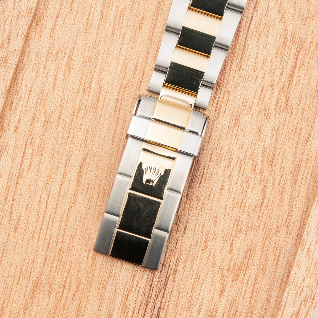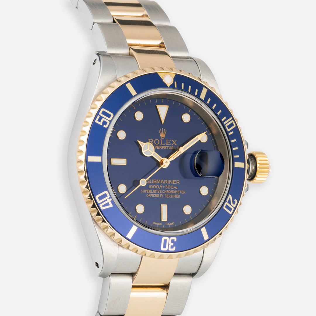 A sweet-spot Submariner Date with classic proportions, with the added flair of a two-tone 18K yellow gold case, and a beautiful blue sunburst dial with luminova indices and hands. This example features the desirable Solid End Links (SEL) with a Holes-Case.