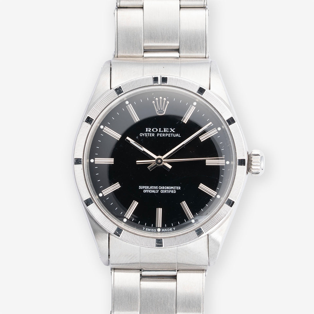 This Rolex Oyster Perpetual Ref. 1007 features a tritium service black gilt dial paired with matching tritium hands. The original steel engine-turned bezel adds vintage character to the classic mid-size 34mm Oyster case.