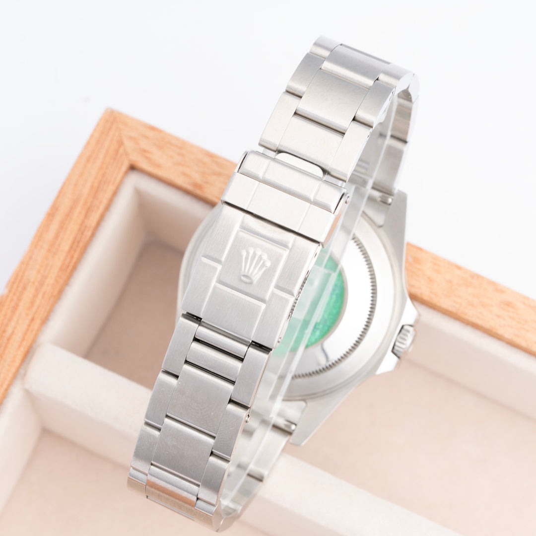A rising favorite among collectors, the Explorer II ref. 16750 is available in either the sleek gloss black dial or the sought-after white “Polar” variant. As one of the standout neo-vintage five-digit references, it offers the dependable reliability of a 1990s–2000s Rolex while retaining a timeless 40mm case size that wears comfortably on any wrist. This later-production example features a holes case paired with solid end links—an especially desirable combination for enthusiasts.