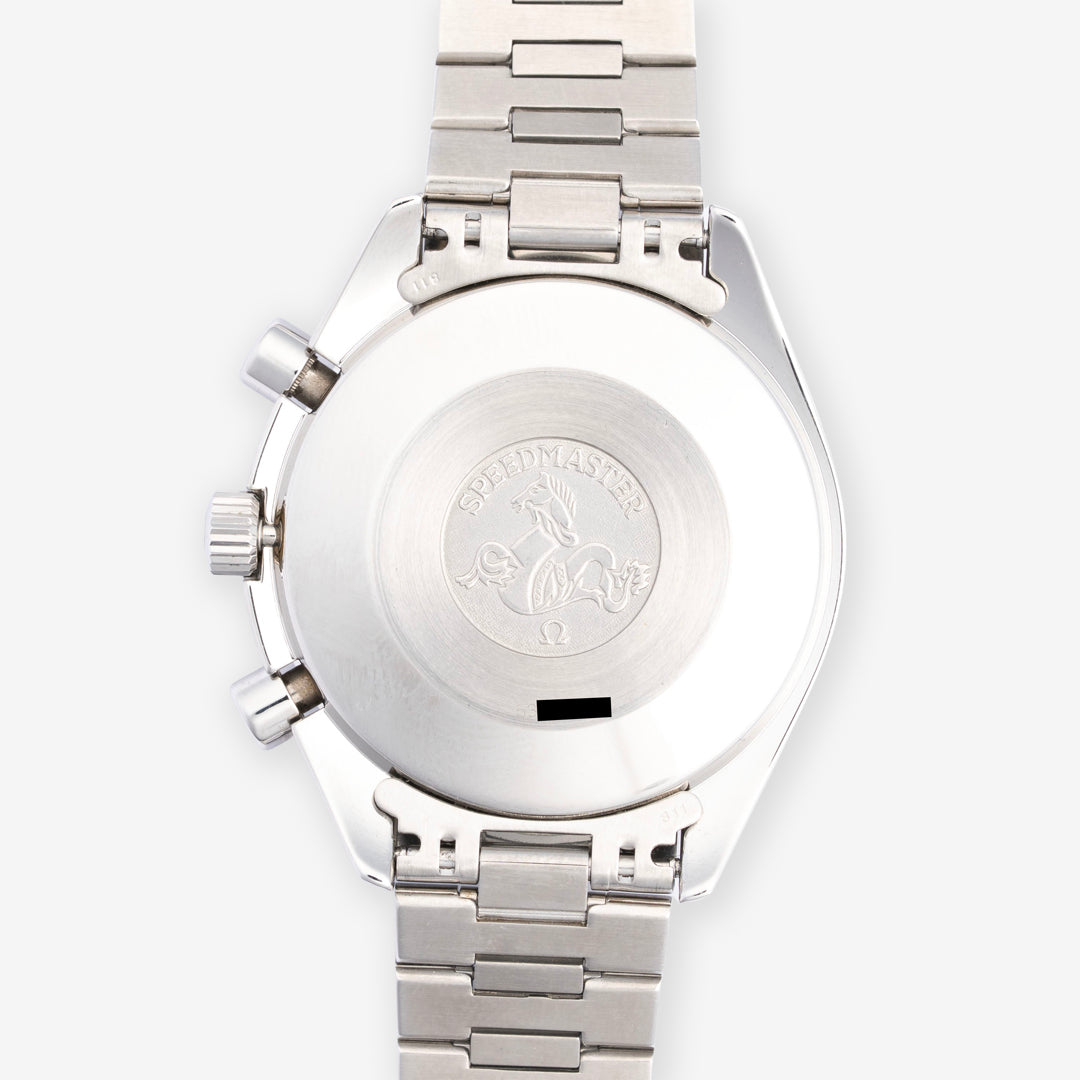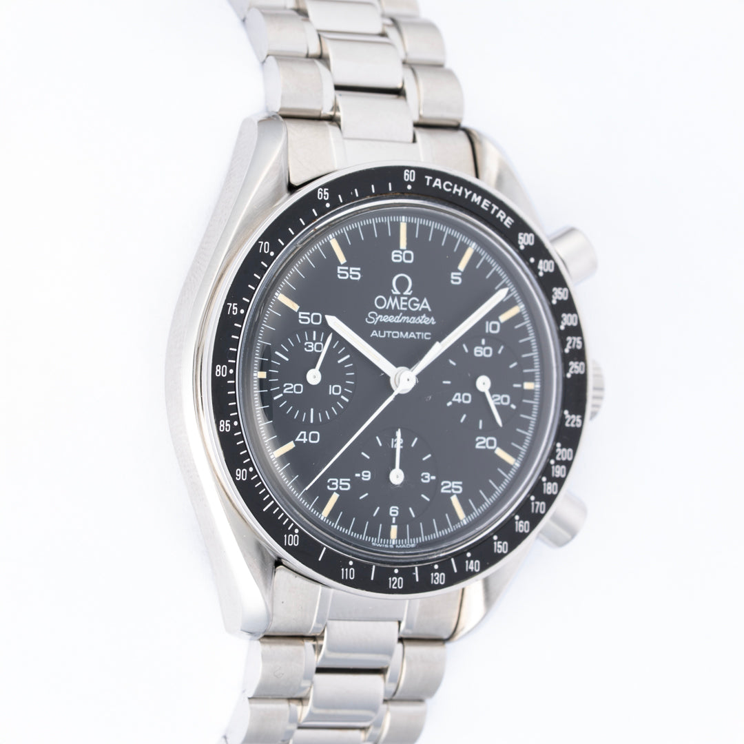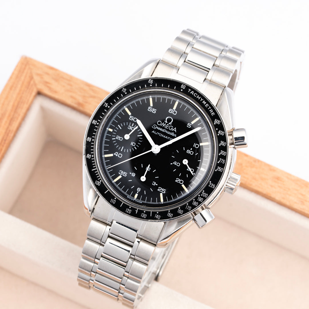 This Speedmaster Reduced is a tritium example that is in excellent pre-owned condition. The dial and hands are in excellent condition with no major flaws to note. Possibly some light superficial marks on the caseback and bezel. The caseback is marked with a hippocampus logo with a serial number, 53m. The watch includes the original box and papers dated 1992.