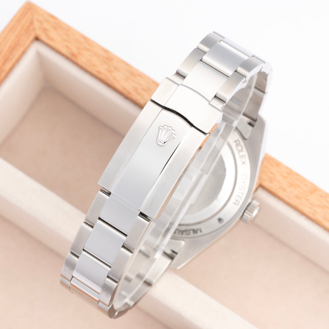 The Rolex Milgauss, first introduced in 1956 with the ref. 6541, is renowned for its precision in high magnetic fields, catering to scientists requiring a resilient timepiece. Unique to the 116400GV version is its green sapphire crystal, known as "glace verte," providing a distinctive green halo around the dial's edge, setting it apart from the discontinued non-GV version with clear sapphire. The now discontinued Milgauss stands out for its functionality and distinctive design, making it unmistakably recognizable by its signature orange lightning bolt seconds hand.
